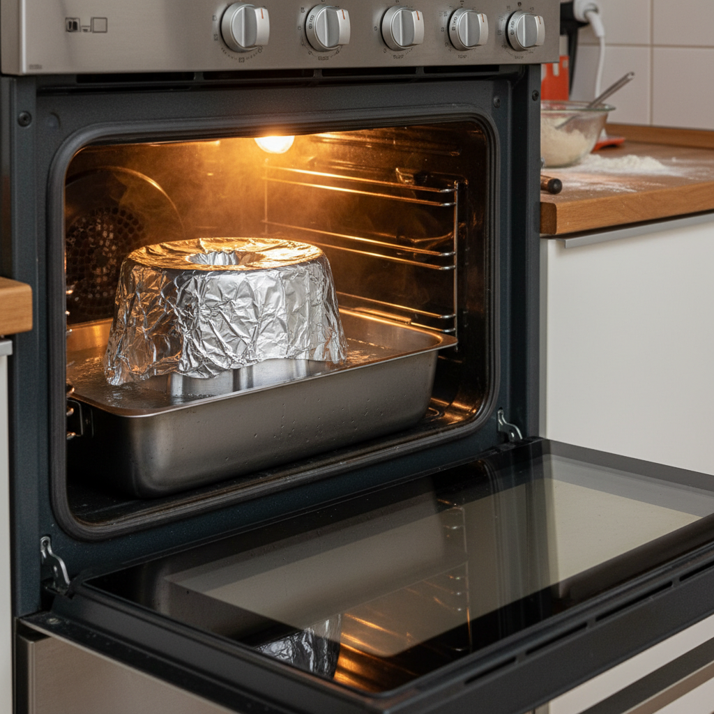 - Cubra a forma com papel-alumínio, com o lado brilhante voltado para dentro (em contato com o brigadeirão). Isso ajuda a reter a umidade e cozinhar de forma mais suave.