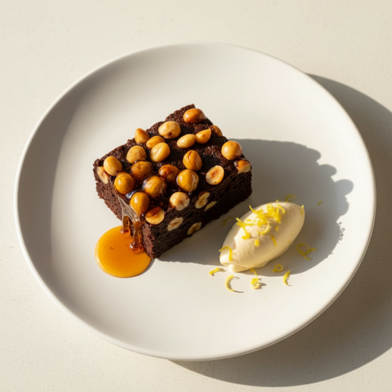 - Finalizar com Creme e Raspas: Ao lado do brownie, coloque uma porção do creme de cupuaçu gelado. Finalize com raspas frescas de limão sobre o creme de cupuaçu para um toque cítrico e aromático. Sirva imediatamente.