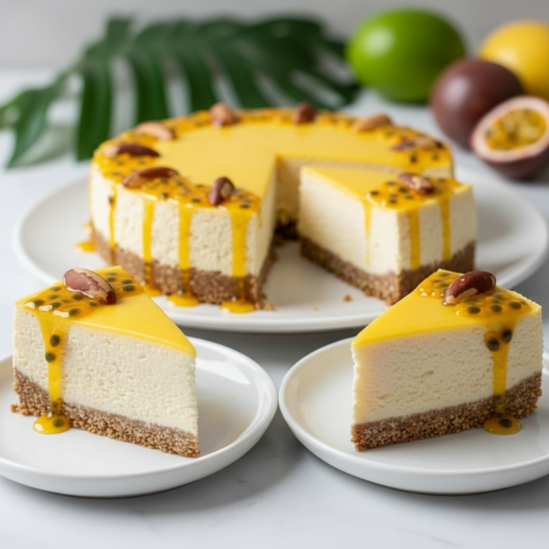 Conhecido como “fruta da paixão”, o maracujá é nativo da América Tropical. Sua polpa ácida e aromática é amplamente utilizada em sucos, doces e molhos. No cheesecake, o maracujá não só confere um sabor cítrico e refrescante que equilibra a doçura e a riqueza do creme, mas também uma cor vibrante que o torna visualmente atraente. Além do sabor, é rico em vitaminas A e C, e possui propriedades calmantes.