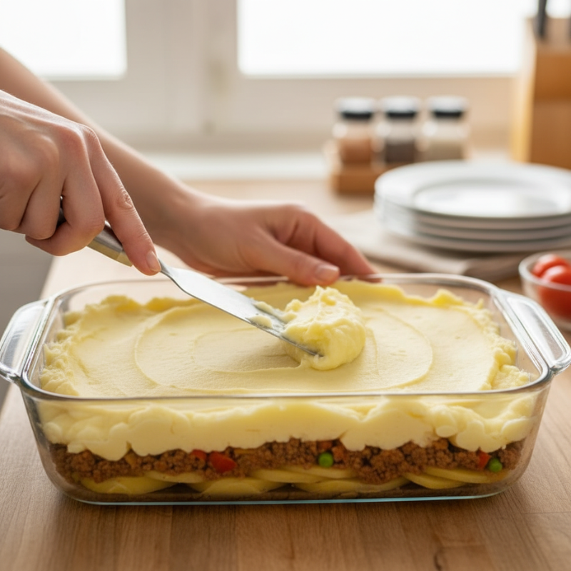 - Finalize com o restante do purê, cobrindo toda a superfície da carne moída. Alise bem com a espátula.