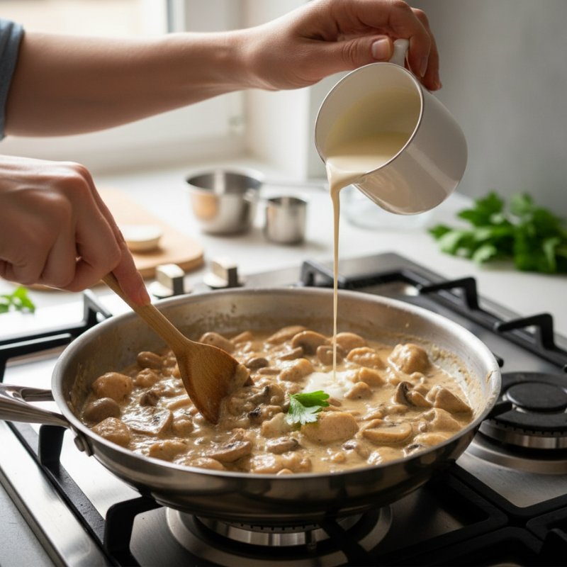 • Adicione o creme de leite e mexa delicadamente até obter um molho homogêneo e cremoso.