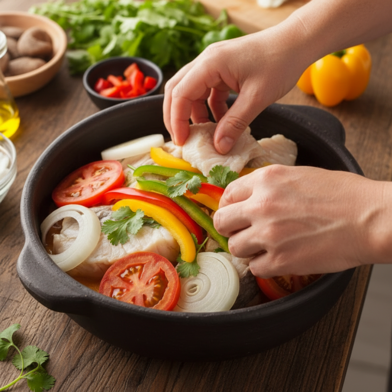 - Repita as camadas até finalizar todos os ingredientes, garantindo que o peixe fique sempre entre os vegetais para cozinhar no vapor e absorver os sabores.