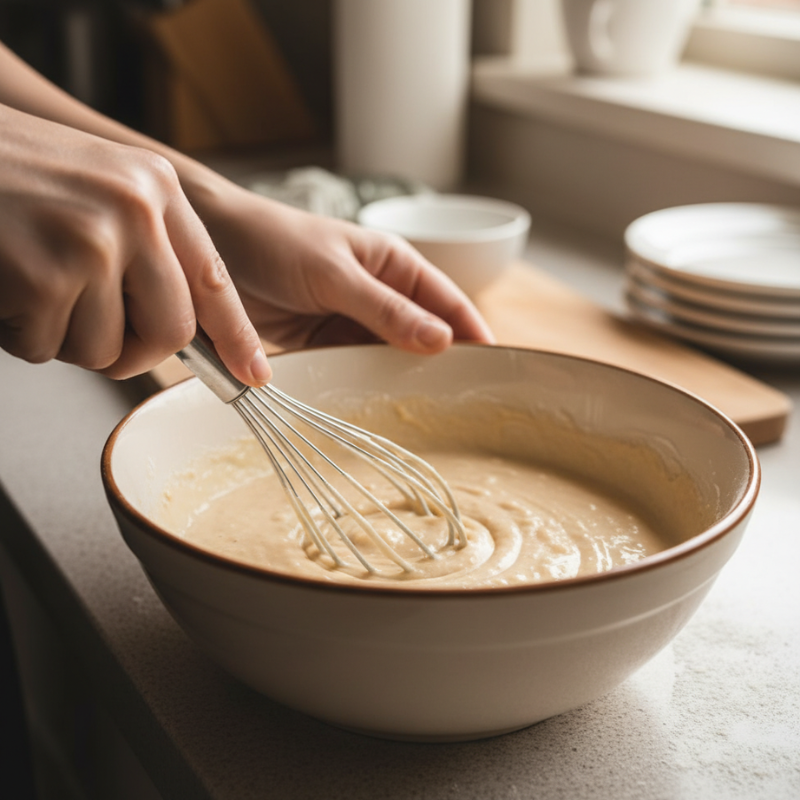 • Mexa apenas até incorporar. A massa deve ficar levemente encorpada e com alguns grumos — isso é normal e ajuda na textura fofa e aerada da panqueca. Evite bater demais para não desenvolver o glúten da farinha, o que deixaria a panqueca pesada.