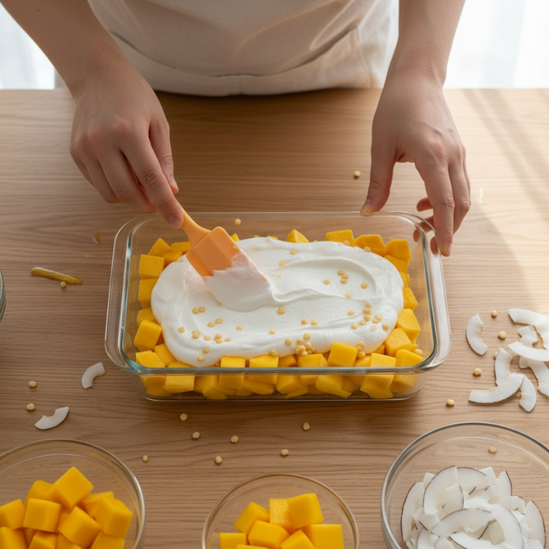 • Finalize com a cobertura de coco cremosa, espalhando-a por cima da camada de manga. Você pode criar um visual mais rústico ou alisar a superfície para um acabamento mais elegante.
