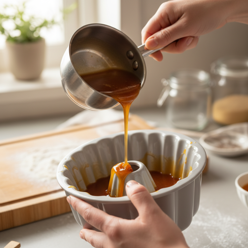 • Despeje a calda imediatamente na forma de pudim, espalhando-a no fundo e nas laterais, girando a forma. Reserve.