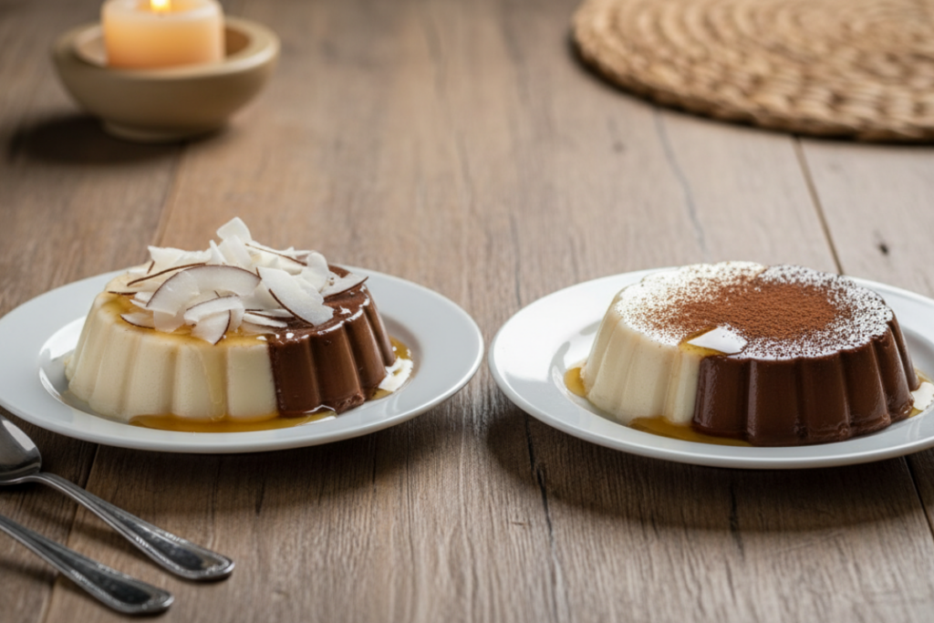 Pudim bicolor de coco e chocolate com caldaservido em prato branco, pudim diferente, pudim de coco, pudim de chocolate, sobremesa criativa, pudim caseiro, receita de pudim