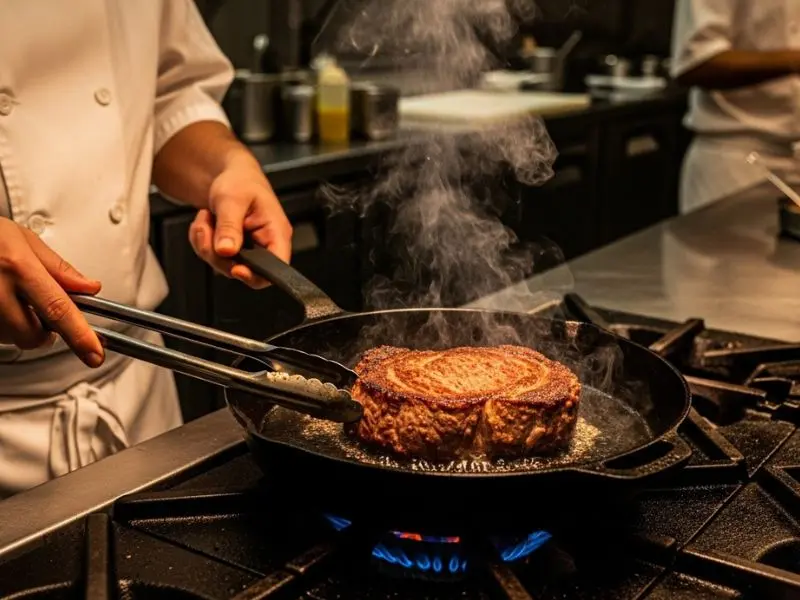 Além disso, a umidade na frigideira cria vapor — que cozinha a carne em vez de selar. O resultado é aquela textura acinzentada, sem crosta, com líquido ao redor que o sous-chef apontou em mim.