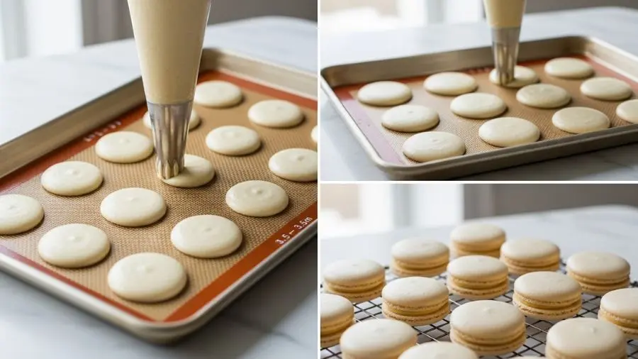 Transfira a massa para saco de confeitar com bico liso nº 8 ou nº 10. Sobre tapete de silicone para macarons ou papel manteiga com molde, faça discos de 3,5 cm, mantendo o saco perpendicular à superfície e sem mover durante a pressão. Bata a assadeira levemente na bancada três vezes para liberar bolhas de ar. Deixe descansar até o croûtage estar completo.