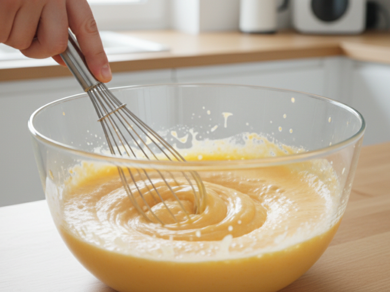 - Com um fouet ou batedeira em velocidade baixa, bata a mistura até obter um creme liso e homogêneo. Evite bater demais para não aerar excessivamente.