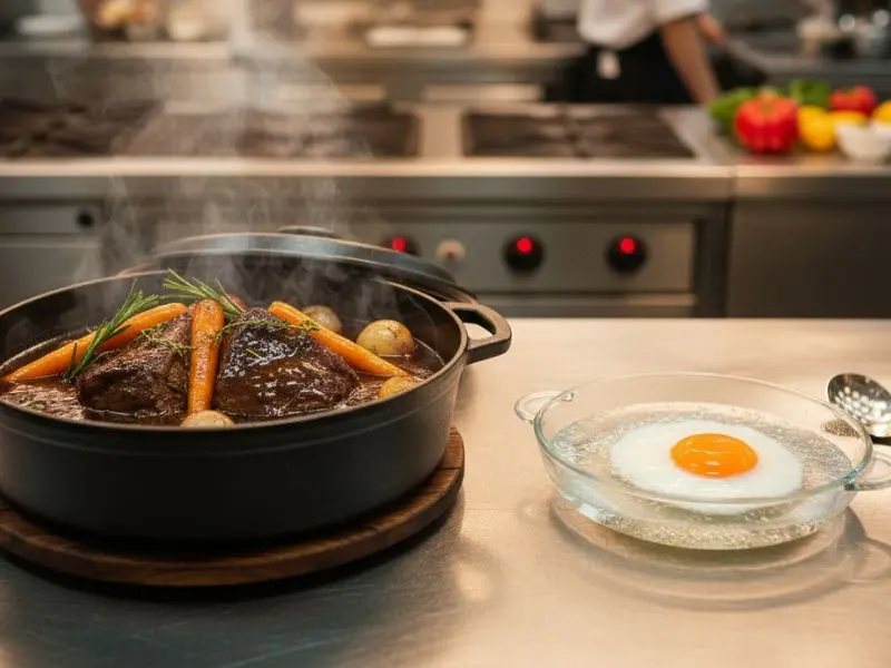 “O mesmo princípio — calor úmido — aplicado de formas completamente opostas. O braseado exige horas. O pochê exige segundos. Ambos exigem técnica. 🍳” –>