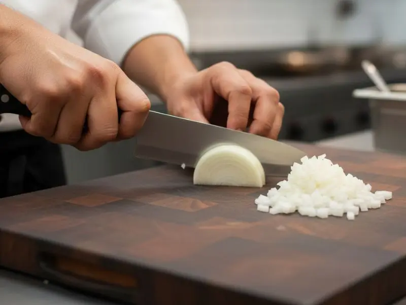 Naquele primeiro dia no Le Cordon Bleu, depois da frase do chef sobre técnica e receita, ele pegou uma cebola e a cortou em brunoise perfeita — 2mm × 2mm, cada cubinho idêntico — em menos de 45 segundos. Sem olhar para a faca. Sem hesitar. Com a naturalidade de quem respira.