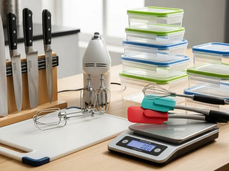 1. Quais são os utensílios de cozinha mais essenciais para ter em casa? Os utensílios mais essenciais incluem um bom conjunto de facas (chef, serra, legumes), tábuas de corte separadas, um mixer de mão, balança digital, potes herméticos transparentes, espátula de silicone e uma panela antiaderente de qualidade.