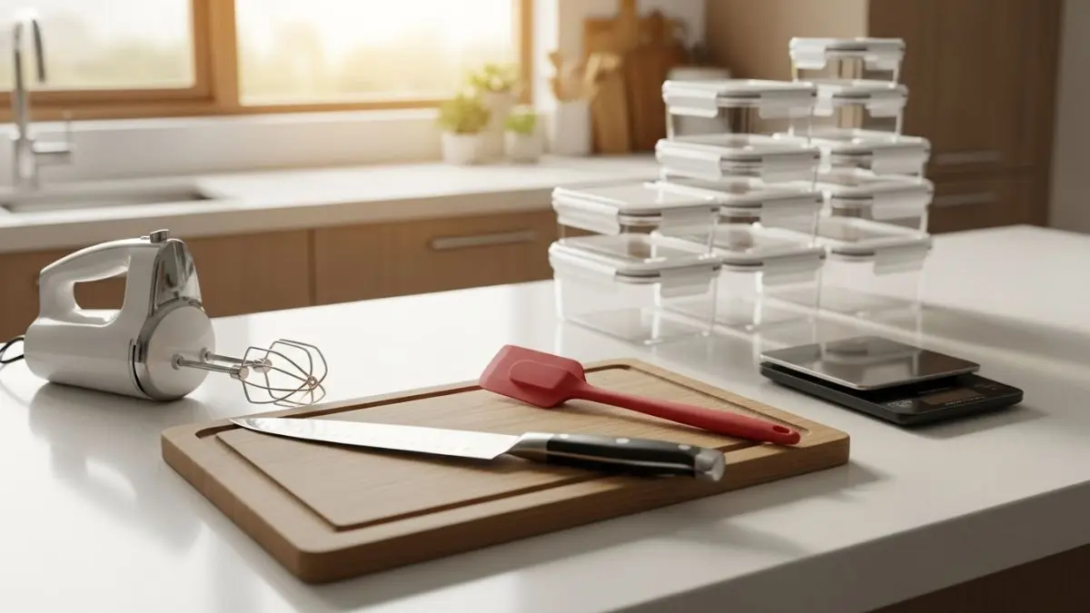 1. Quais são os utensílios de cozinha mais essenciais para ter em casa? Os utensílios mais essenciais incluem um bom conjunto de facas (chef, serra, legumes), tábuas de corte separadas, um mixer de mão, balança digital, potes herméticos transparentes, espátula de silicone e uma panela antiaderente de qualidade.